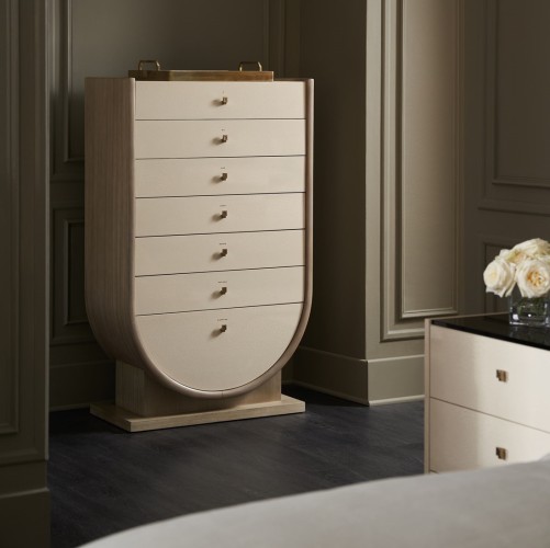 Drawing the eye with its striking shape and height, this semainier chest lets you create a one-of-a-kind, sensory experience. With a graceful form inspired by Grecian pottery, it features seven drawers, one for each day of the week, notated by corresponding brass brads and tactile hardware that can be seen and felt, even in low light. Perfect for keeping lingerie and linens, its Ivory Craze finish adds to its alluring texture and elegant presence.