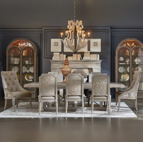 The each item of the Arch. Salvage Dining Room Collection by ART Furniture is thoughtfully crafted after months spent meticulously researching architectural details from old European structures. The concept was born to address the trend of old elements being repurposed by artisan craftsman into new buildings and furniture. The collection is constructed of parawood solids and cathedral elm veneers. The chic detail of industrial X-braces takes the Pearce Dining Table from traditional to contemporary. The ends of the table are supported on two robust scrolled pedestals; the parquet top is pieced with cathedral elm veneers. The table seats up to twelve people with the addition of a 26" leaf. The top of the Pearce Dining Table is finished in Parch, a light open-grained finish; the base is in Cirrus, a neutral painted finish that has been rubbed and gently aged by hand.