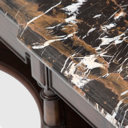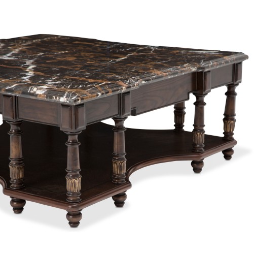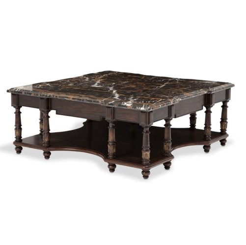 This Freestanding Aristocrat square cocktail table features a shaped, beveled, marble top, carved legs, and a Cordovan finish.