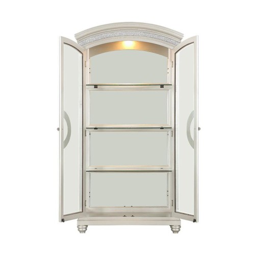 Make your dining room the centerpiece of your home with the Maverick dining set. This unique set comes in a platinum finish and sparkling rhinestone. The removable extension leaf which will create plenty of seating space and a welcoming place for all those who gather for a meal. Enhance your dining area with this stunning set.