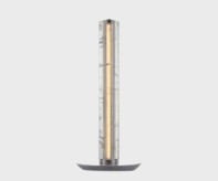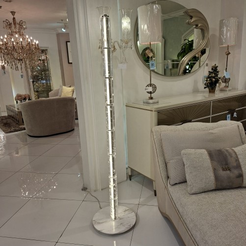 Astre Fauvette Floor Lamp Clouded Crystal LED, as shown, features a striking design with crystal and elegantly supported by satin finish stainless steel. Its geometric form and polished surfaces create a sophisticated lighting solution that enhances any contemporary space, marrying beauty with functionality seamlessly.