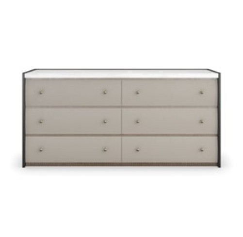 With a rustic elegance reminiscent of rural France, this dresser features tactile drawer fronts in a Rockport Burnished Adobe finish. Drawing the eye to its architectural design: a striated white onyx marble top, warmly contrasted by end panels in Craftsman Bronze Paint and an Antique Bronze Leaf dentil molding detail along the base. Features six spacious drawers with painted interiors and ball hardware in Brushed Gold for an accentuating element that ties it to our Provence bed.