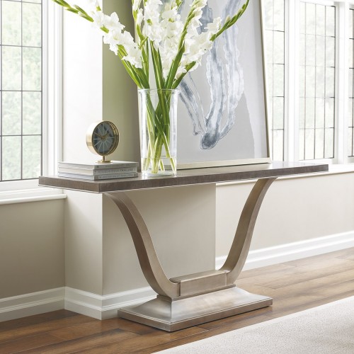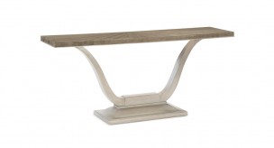 This slim rectangular console is simple and stylish. The top is a beautiful piece of Quartered Ash veneer, finished in Elegant Linen and inset in a fan pattern with a thin bead of Soft Silver Leaf at the base. Two tulip shaped legs curve from the top to a classic, rectangular base – all finished in Soft Silver Leaf. This piece adds tasteful elegance to hallways and small dining rooms.