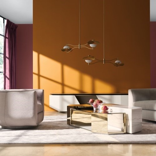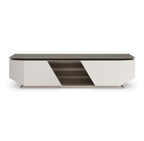 A futuristic form meets modern function for a statement-making media console that defies the ordinary. Parallel planes intersect with angled lines to create its multifaceted design, artfully defined by a reflective metallic finish. Offers ample storage with Smoked Bronze glass shelves and cutouts along the back for wire management.