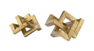 Interlocking iron finished in a heavily antiqued gold. Sizes: S-8x9x5, L-10x11x6. Ayan Gold Decorative Accents Set of 2 (UT 18927) Dimension : W 26 cm x D 16 cm x H 28 cm Material : Metal Weight : 3 kg By Malindafurniture