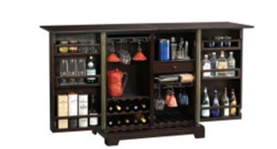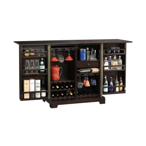 The top opens up and slides to the left, expanding to 77\" and providing increased space for entertaining. An accessory drawer for ample utensil storage features quality dovetail construction with smooth running metal slides. Two adjustable stemware racks can store up to 18 large wine goblets. They also act as a shelf for extra storage. Four adjustable shelves store up to 20 bottles of wine. Each shelf is reversible so that it can be used for alternate storage. Pad-Lock metal shelf clips lock the shelves into place. Continuous holes are included for maximum shelf adjustment. Locking doors for added security.