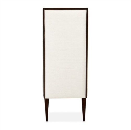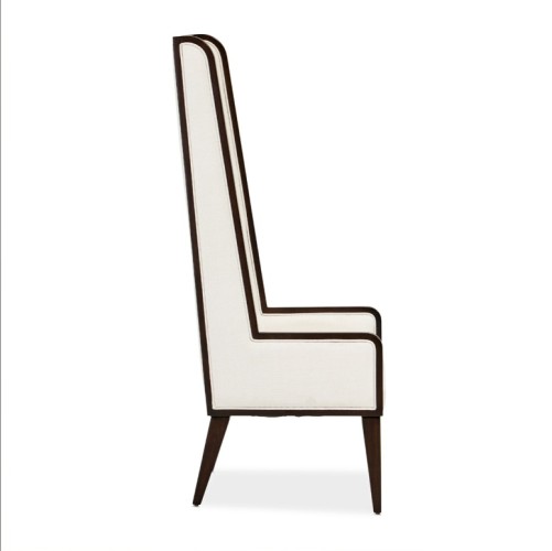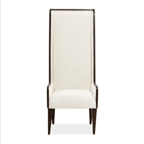 Elegant High-Back Chair: Fully upholstered in soft cream fabric with a tailored silhouette, offering both comfort and sophistication.