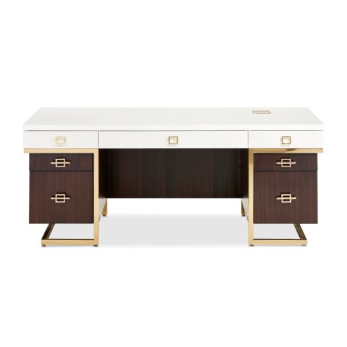 Refined Storage Solutions: Multiple drawers with signature geometric hardware keep your workspace organized without sacrificing style.