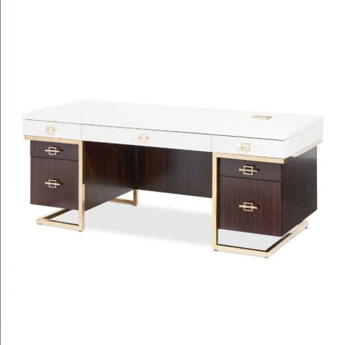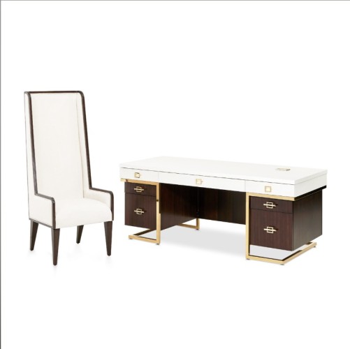 Where executive function meets modern glamour, the Belmont Place Desk and Chair Set brings commanding presence to any workspace. The desk’s expansive silhouette pairs a pristine white anigre top with a rich, dark espresso base, framed in gleaming gold for a statement of refined authority. Sleek hardware, geometric lines, and thoughtful storage offer both beauty and utility, while the high-back chair—upholstered in an elegant cream fabric—provides the perfect balance of comfort and stature.