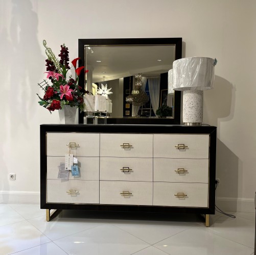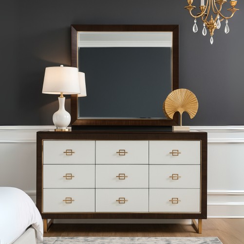 The Belmont Place Dresser & Mirror Set is where classic elegance meets contemporary charm. Bask in the allure of the pristine white anigre veneer fronts, which are beautifully contrasted against the backdrop of the profound espresso eucalyptus. Each drawer, nestled within a frame accentuated by the glint of Japan gold plated alloy, promises a world of refined organization. Dark brown velvet-lined interiors whisper secrets of luxury, while the dresser’s poised stature, supported by gleaming gold legs, becomes an ode to meticulous artistry.