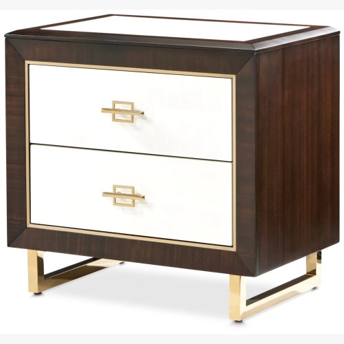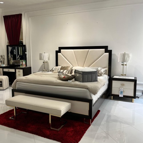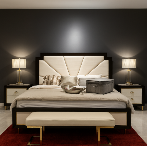White Anigre Inlay & Gold Plated Legs: The footboard is adorned with a lustrous white anigre veneer framed in rich espresso, while sculptural legs crafted from Japan gold-plated alloy bring a bold, gleaming foundation to the bed’s silhouette.