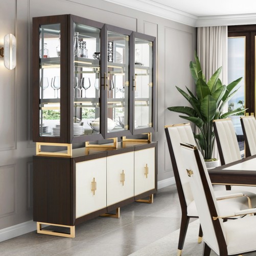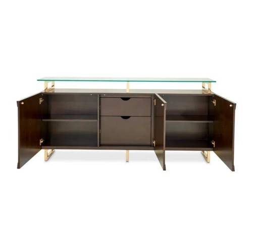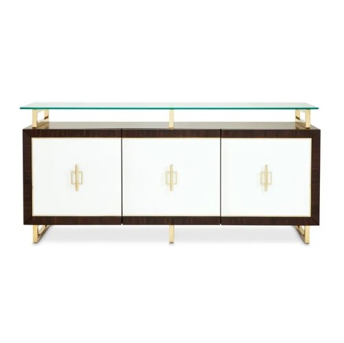 The Belmont Place Sideboard combines modern beauty with traditional grace. Savor the charm of the immaculate white anigre veneer door fronts and glass-top shelf which stand out against the deep espresso eucalyptus frame. The gleam of the gold-plated alloy, from Japan, highlights a world of sophisticated organization.
