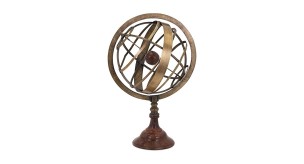 Striking armillary globe set in a brass-toned frame and resting on a hand-carved base. Completely handcrafted from iron and she sham-wood. Due to the handcrafted nature of this product, no two will be identical. Armillary Sphere measures 12.5 W x 10.5D x 19 H in. Dimension : W 32 cm x D 27 cm x H 49 cm Material : Metal Weight : 4 kg By MalindaFurniture