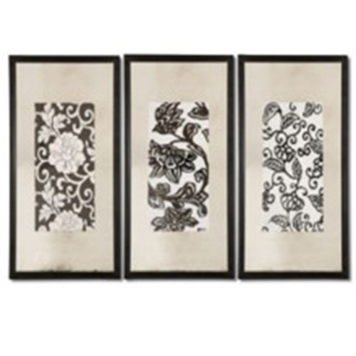 These botanical prints feature a contemporary take on an antique style. Each black and white print is surrounded by a light tan burlap mat. The outer frames have a heavily distressed black finish with a gray and taupe wash. The inner lips and fillets have a medium wood tone base with a heavily distressed white painted finish and a gray and taupe glaze. Each print is placed under protective glass.