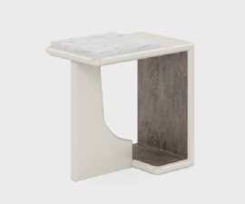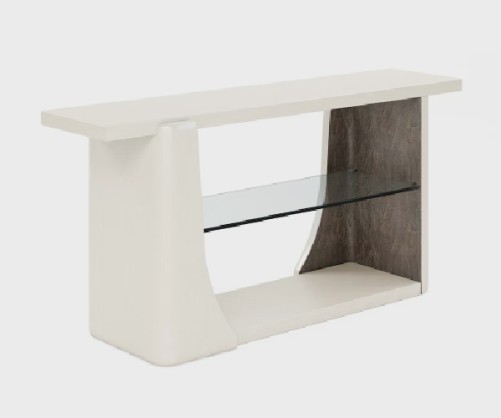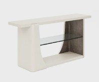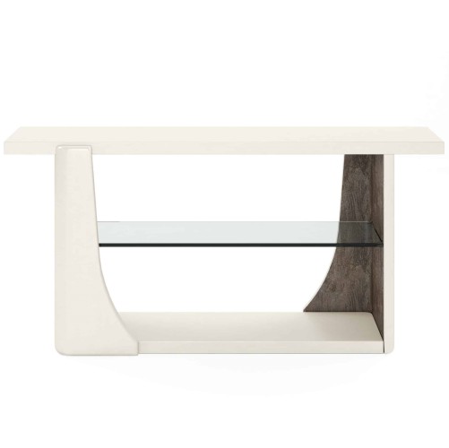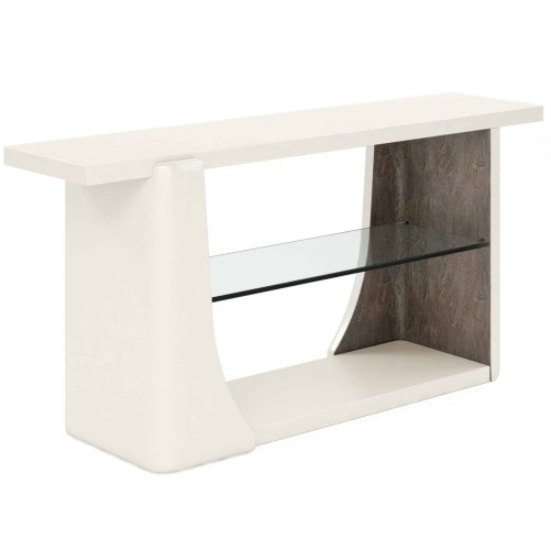 This stylish console combines eye-catching form with practical function. Clean lines and solid wood construction are beautifully highlighted by a warm alabaster finish, with subtly curving sides that reveal a burnished bronze, gesso patterned interior with a uniquely patterned surface. A lower glass shelf provides additional space for decor items and accessories.