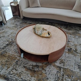Understated yet elegant, this artful cocktail table is a celebration of materiality and simple form. Features an ample top in an Ivory Craze crackle finish, supported by a trio of Brushed Gold metal blades, perfectly distributed to create open space for storage and display. A swiveling plinth base adds intrigue and function.