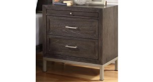 Champagne finish metal base and framed details brings a sleek and modern appeal this low-profile bed. The beauty of the wood veneer is highlighted by a multi-step walnut finish.