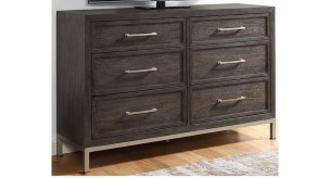 Champagne finish metal base and framed details brings a sleek and modern appeal this low-profile bed. The beauty of the wood veneer is highlighted by a multi-step walnut finish.