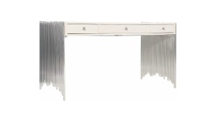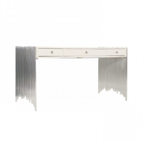 Elevate your workspace with this mesmerizing three-drawer desk. Fabricated from wood with a brilliant silken pearl finish, its base is composed of conjoined metal rods of varying heights. More art than furniture, this desk is simply stunning.