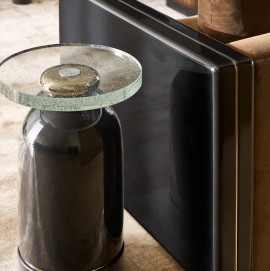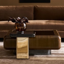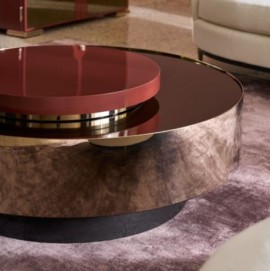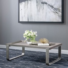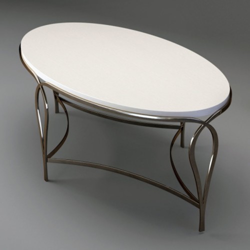 The metal and wood oval cocktail table really shines with a silken pearl finish and bright plated stainless-steel base and frame. Its shapely curves take on a new dimension when viewed from different angles for an alluring, mesmerizing look.