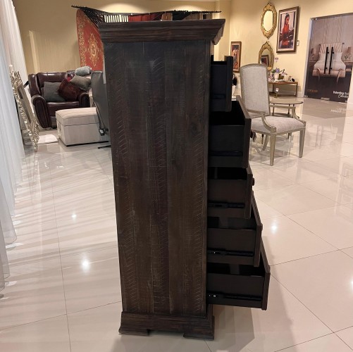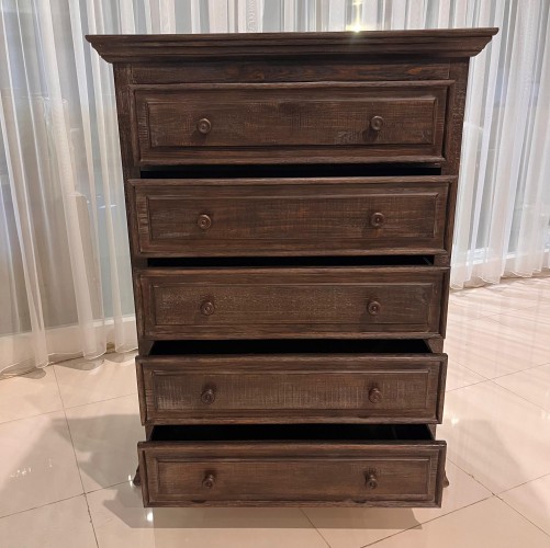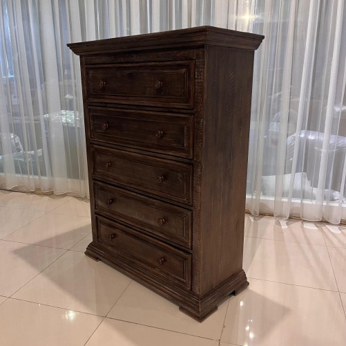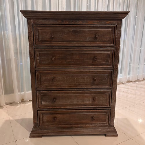Inspired by heavy and hearty lodge-style furnishings from days gone by, this chest of drawers brings the past brilliantly into the present. Distinctive details include robust mouldings, raised panel drawer fronts for rich dimension and a distressed aged pine color finish with light wire-brushed texture that’s pure artistry. Five roomy drawers stack up to an organized wardrobe.