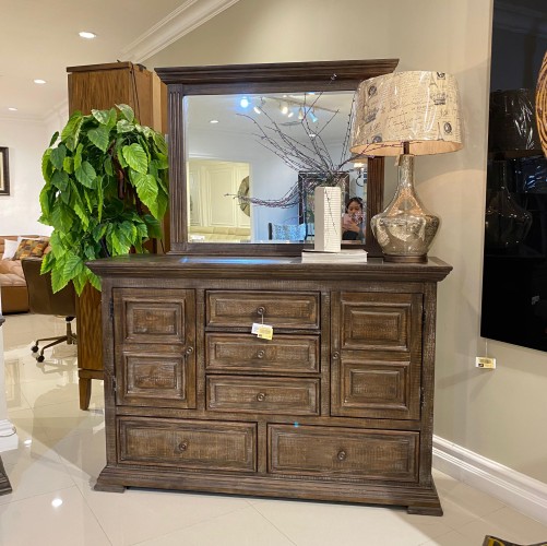 Inspired by heavy and hearty lodge-style furnishings from days gone by, this dresser and mirror set brings the past brilliantly into the present. Distinctive details include robust mouldings, raised panel drawer fronts for rich dimension and a distressed aged pine color finish with light wire-brushed texture that’s pure artistry. Clever combination of drawer and cabinet space works wonders for an organized wardrobe.