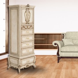 Camden Court is made for the chic living space. Pearly finishes, platinum details, and gorgeous crystal ornaments that add a lovely touch of glamour. Centered by a creamy color palette, each piece delivers a modern silhouette that\'s customizable, fresh, and ready for your elegant home. Be unique! The Camden Court Lingerie Chest offers a classy space for your accessories and delicates, all while adding a splash of glamour to your room. This chest features top shelving space with a removable jewelry caddy, velvet lined drawers, and a 360 swivel base that lets you turn to a full-length mirror on the back!