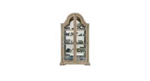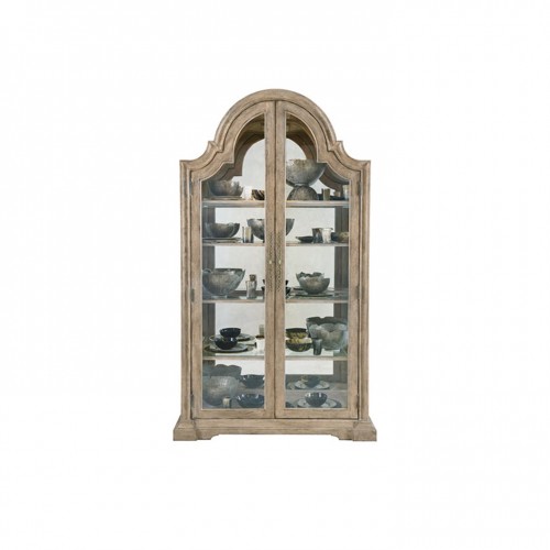 Flat cut white oak veneers. Two wood-framed doors and curio ends with lightly seeded inset glass. Behind doors are three wood-framed, adjustable/ removable tempered glass shelves. One center fixed wood-framed tempered glass shelf. No plate grooves. One halogen light with touch dimmer switch. Antiqued mirrored back panel. Interior adjustable glides. Anti-tip kit. Weathered Sand finish.