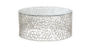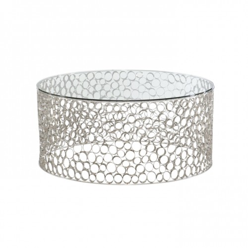Bring some dramatic style to your living space with this round cocktail table. Your eye is instantly drawn to the polished stainless steel base, which boasts hundreds of small open circles and ovals for a unique design element. A lay-on tempered glass top sits atop the base and reinforces the open and airy atmosphere.