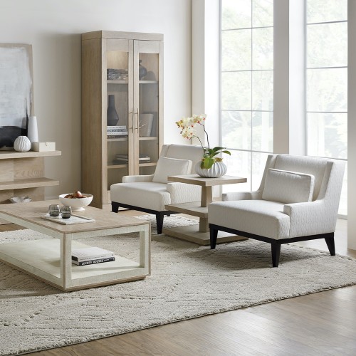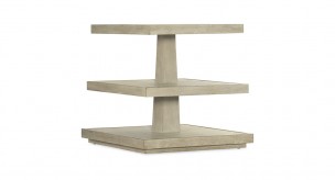 This 3-tiered, square-shaped end table in a soft taupe finish on lacquered burlap and oak veneers with dry-brushing has a tactile texture and organic chic appeal. The tiers can be used as shelves for display or storage. Designed to interject a sense of calm and tranquility into interior spaces, the Cascade Collection creates an elegant - yet livable retreat from our modern day, fast-paced lifestyles. Characterized by its light and airy neutral color palette and use of mixed materials including oak, lacquered burlap, metal accents and champagne-tone hardware, the collection's modern styling can easily find its way into a variety of interiors across the country. As soothing as water falling from a steep rocky slope, the Cascade Collection was designed to spark Zen, tranquility and calmness in any living space..