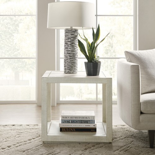 Get your Zen on with the Cascade End Table, combining a lacquered burlap finish with an Oak Veneer top and trim in a soft, serene taupe finish. The airy vibe and rectangle shape is a simple, stylish and practical addition to any living space. Designed to interject a sense of calm and tranquility into interior spaces, the Cascade Collection creates an elegant - yet livable Ð retreat from our modern day, fast-paced lifestyles. Characterized by its light and airy neutral color palette and use of mixed materials including oak, lacquered burlap, metal accents and champagne-tone hardware, the collection's modern styling can easily find its way into a variety of interiors across the country. As soothing as water falling from a steep rocky slope, the Cascade Collection was designed to spark Zen, tranquility and calmness in any living space.