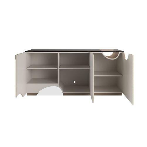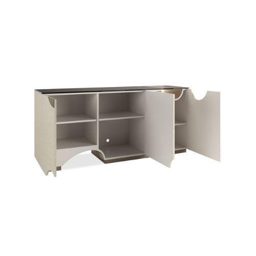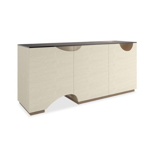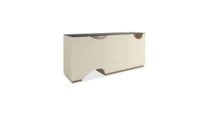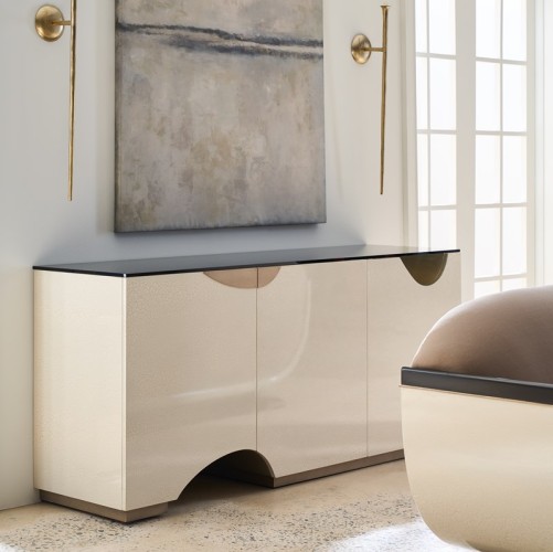 This three-door media console is distinguished by its offset oval, see-through chasm on the bottom left of the chest. The chasm softens the look of this modern linear piece with its curves and shimmering Brushed Gold paint. The console’s outside is finished in Ivory Craze crackle paint, lending a stone-like quality to the piece. Three touch-latch doors have asymmetrical oval cutouts in Taupe Silver Leaf. The interior is finished in Almond Milk with three adjustable Smoked Bronze glass shelves and wire management access. The piece has a base in Brushed Gold paint.