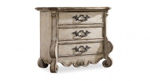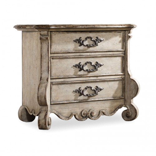 Create a romantic bedroom retreat in the spirit of iconic Parisian interiors. The Chatelet three-drawer nightstand blends European farm style with elegant details for a look of livable luxury. The distressed vintage white finish and burnished bronze hardware completes the timeless design. The top drawer is wallpapered, the bottom drawer is cedar-lined. Three-plug outlet with USB port.