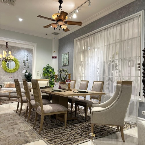 With a mix of clean-lined, modern design and traditional silhouettes, the Cityscapes Dining Room Collection by ART Furniture brings home the serene spirit of a luxurious spa vacation. The design influence ranges from crisp modern lines to beaded and bow front transitional. Simple and simply beautiful, the oak top of the Bedford Rectangular Dining Table is finished in a shade of finish called Stone and has been gently wire brushed to bring out the texture of the oak grain. The imposing singe square pedestal is embellished with bright metal accents. The table sits six closed but can be expanded to accommodate up to ten chairs.