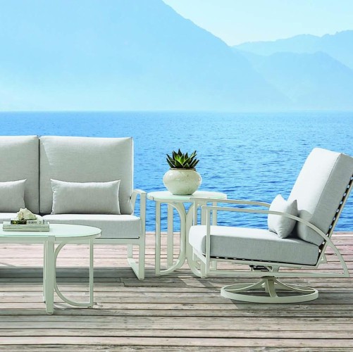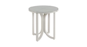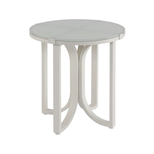 The top of the Cityscapes Outdoor Manning End Table by ART Furniture is a thick slab of frosted glass supported on a pair of matching pedestals constructed of joined half-rounds. The cocktail table's frame is constructed of aluminum finished in Cloud-toned powder coating.