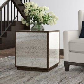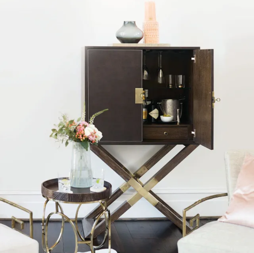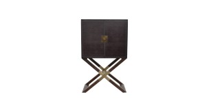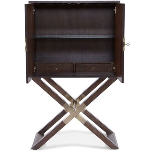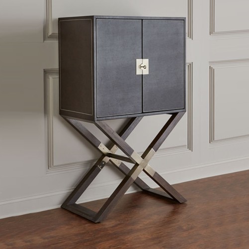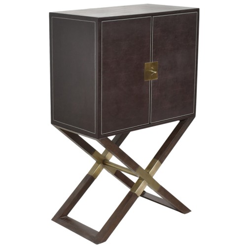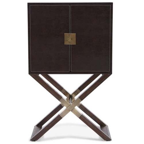 Solid and masculine in form, the Clarendon bar cabinet from Bernhardt has two doors wrapped in Vienna walnut bonded leather with contrasting stitching. There is one adjustable shelf inside, and the wood base has stainless steel accents.
