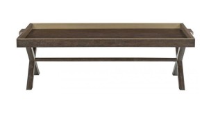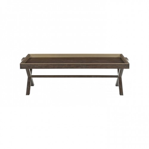 The Clarendon Rectangular Cocktail Table by Bernhardt furniture features ash solids with quartered white oak veneers, fixed wood tray top with stainless steel frame, handles in Burnished Brass finish and adjustable glides.