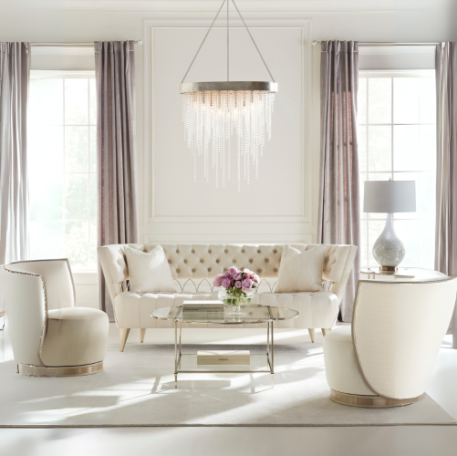 This button-tufted beauty offers inimitable style. Its shapely silhouette features a decorative inset metal frame with an open pattern of connecting circles—the symbol of no beginning and no end. A Whisper of Gold metal finish highlights its one-of-a-kind frame, and complements the dressy textured pure ivory fabric of its tufted, upholstered back and seat. With perfect proportions, the sofa is finished with fashion-inspired legs.