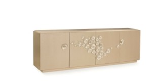 A dazzling focal point, our 103 inch console is designed to meet all of your entertaining needs and leave your guests star-struck. It offers the perfect proportion to anchor a large screen television to handily serve a crowd from its beautiful creamy white stone top in the room. In stunning contrast to its soft, Luminous finish, the facade is adorned with a recessed artful scatter design that is finished with hand applied Gold Bullion Leaf. The entertainment consoles interior features left and right compartments with two adjustable shelves, as well as a center compartment with four drawers and one adjustable shelf.