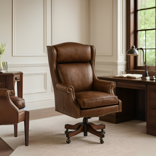 It is found within the desk chairs subgroup. The style of this piece of furniture falls into the traditional/formal category. The texture, finish and surface are dark wood.