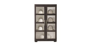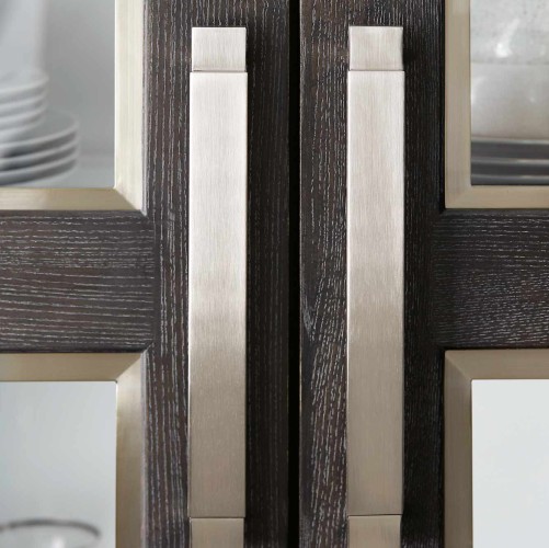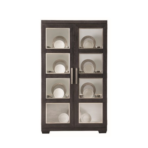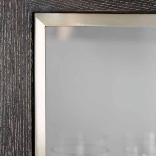Ash solids and Quartered White Oak veneers. Cerused Mink finish. Two wood-framed doors with inset tempered glass panels. Stainless Steel border around each panel in Silver Mist finish. Behind doors is one fixed and two adjustable/removable, wood-framed glass shelves with plate grooves and two halogen puck lights with touch dimmer switch. Each shelf has two inset, tempered glass panels. White interior, Pad feet with adjustable glides. Note: For safety, an anti-tipping kit is included with instruction sheet.