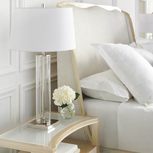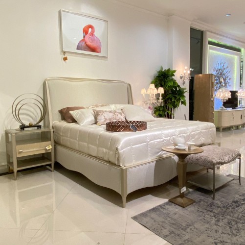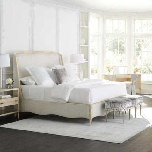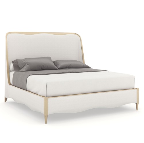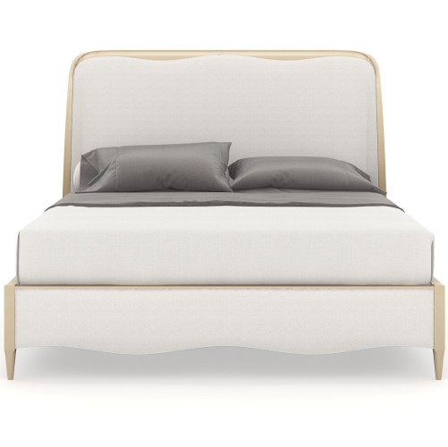 Soft and serene in a light-toned performance fabric, this beautifully upholstered bed engages the senses with a harmonious mix of materials and finishes. Taking a cue from the shapely gingko leaf, it features a gracefully curved headboard, complemented by an undulating footboard and side rails. A Champagne Pearl finish adds subtle shimmer to its wood trim and tapered front legs. The perfect embodiment of casual glamour, with organic, flowing lines inspired by forms in nature.