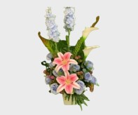 Delphine Mix Blue Pink Corner Arrangement, White Vase
