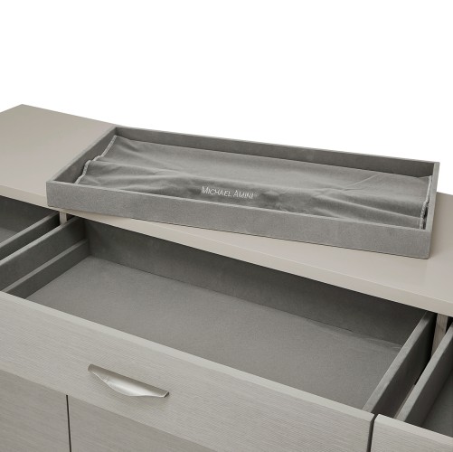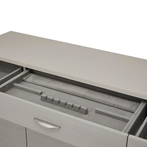 Center drawer includes a velvet lined silverware caddy