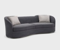 A Dark Chocolate plinth base accentuates this sofa’s Art Deco-inspired lozenge shape, masterfully upholstered in a plush charcoal heathered velvet. Designed with two seat cushions that follow its serpentine front and snuggly sit against its softly curving channeled back. Boxed kidney pillows in a grey and ivory ribbed fabric add contrast and a tactile accent. Style in pairs to create an inviting space for entertaining and conversations.