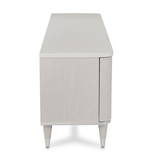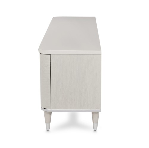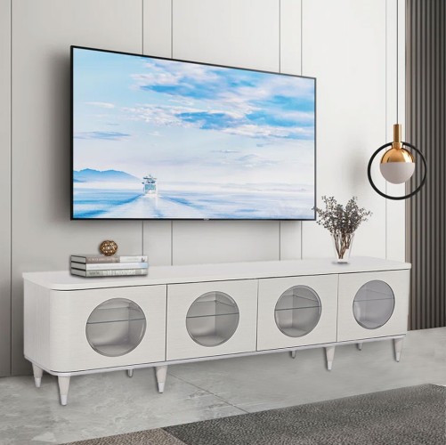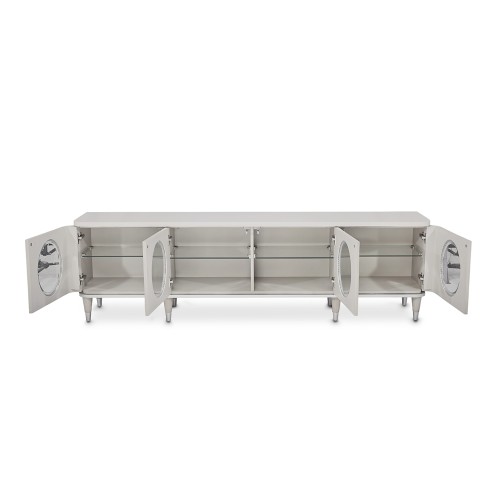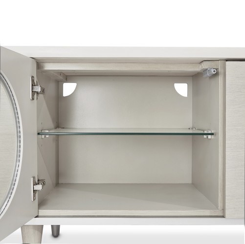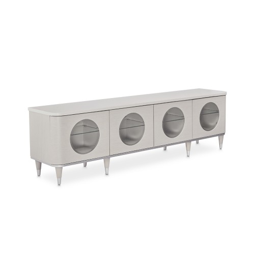 With eye-catching circle windows and plenty of space for your media storage, this marble-topped cabinet is ready to create your flawless display! Eclipse is all about elegant curves and romance with a modern polish. Combining the striking lines of contemporary living and the elegance of designer style, this collection showcases floating stainless steel frames, brilliant LED lighting, and classy snowflake tones. Find that glow you've been looking for!