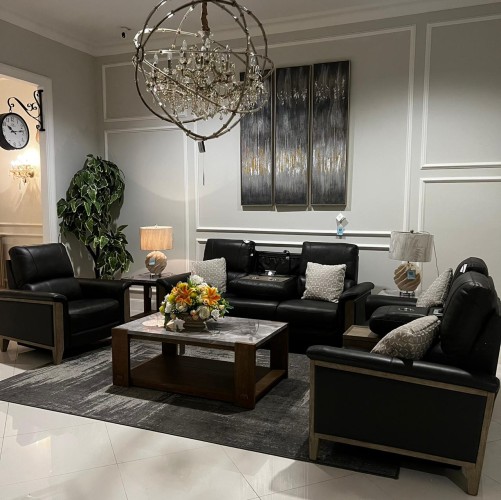A 3-piece high-leg sofa group with a tastefully integrated pull-down console with drink holders/USB charging. These "transformers" are hidden and have the look of a luxury car feature. Also included is a wood console with swivel table and two 18 - inch fabric accent pillows.