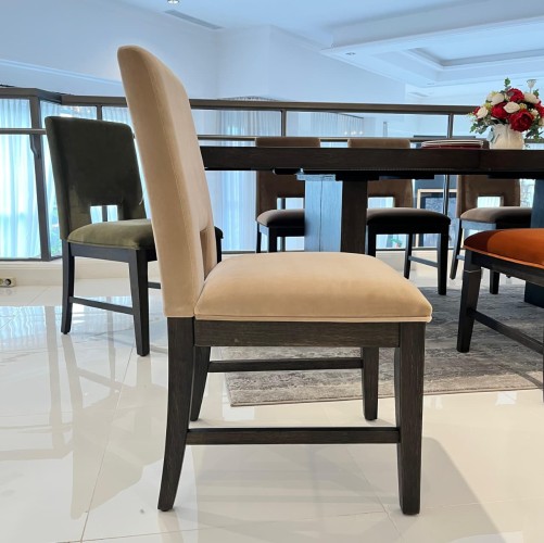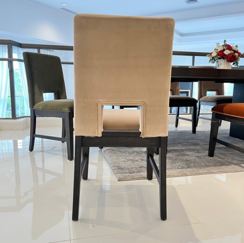 The chair’s soft-touch, breathable velvet, crafted from 100% polyester ensures plush comfort and a luxurious dining experience
