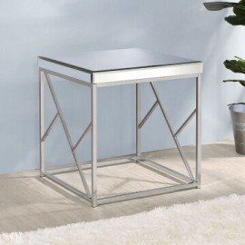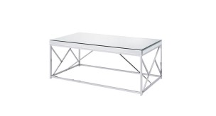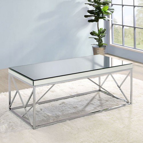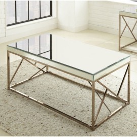The Evelyn cocktail table offers modern elegance with its geometric base design and boxed mirrored top. You will enjoy how the light bounces off the table top and apron Rail to create a larger more vibrant space. The mirrored table also features a sturdy iron base that is finished with a unique copper chrome.