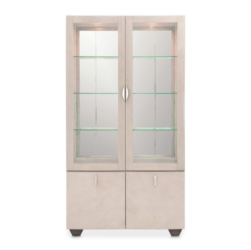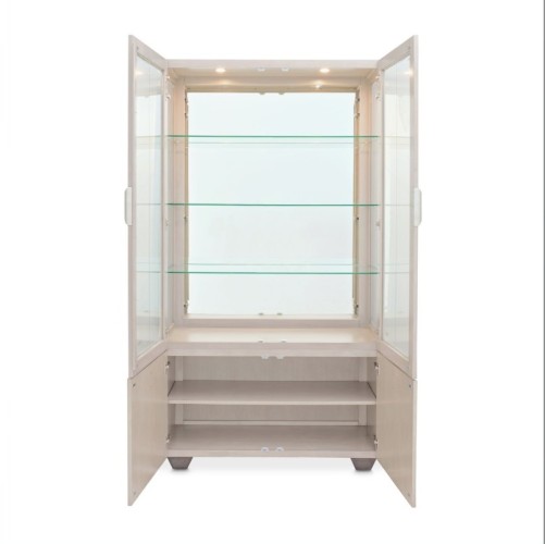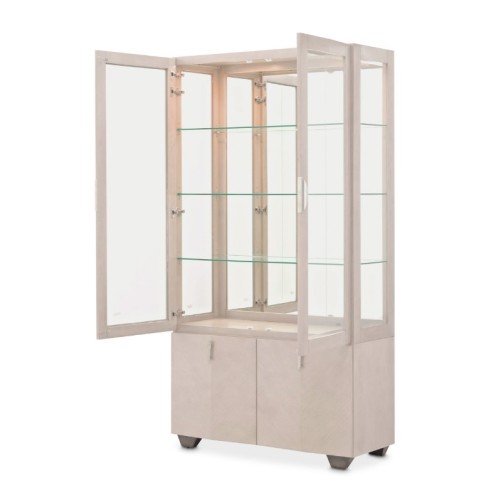 The Fantosini Display Cabinet is a statement of refined elegance, designed to bring a sophisticated ambiance to your home. Its statuesque silhouette is crafted from oak veneers and finished in a luminous silver mist tone that exudes quiet luxury. Framed by clear beveled glass doors, the upper display area features a mirrored back panel and glass shelving that reflect and amplify light, creating a radiant showcase for your treasured collections. Soft LED lighting adds a warm glow, turning each item into a centerpiece. The base is fitted with two soft-close cabinet doors that open to reveal additional storage—perfect for organizing linens, serveware, or entertaining essentials. Sculptural hardware complements the cabinet’s Art Deco influence, making this piece as functional as it is visually striking.